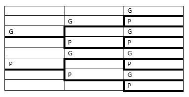 Första, andra och tredje kastet kan man rita som ett träddiagram, till exempel så här, med utfallen gubbe eller pil. För samma sida alla gånger ska det vara antingen G-G-G eller P-P-P.