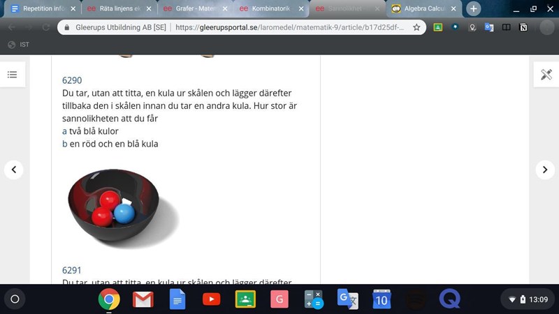 Denna metod har fungerat för att lösa liknande frågor och då uppgift a. Jag förstår att det finns 9 utfall och att det finns 1 möjlighet att ta två blå på raken. Denna princip jag har kört med tabellen har funkat på liknande uppgifter så jag tror att det är rätt metod. Problemet är att jag inte förstår uppgift b då jag anser att svaret skall bli 5/9 men i facit står det 4/9. Kan någon vara så snäll och förklara varför?