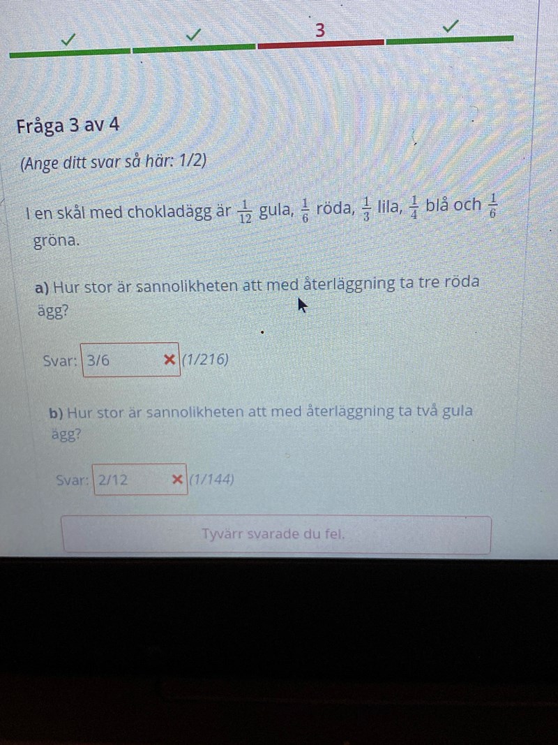 Okej. Hur stor är sannolikheten att första ägget är rött? Andra? Tredje?