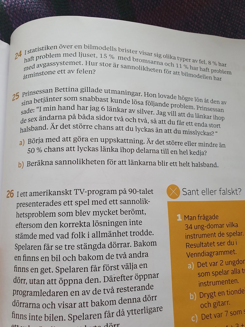 Hej jag har verkligen stött på problem med uppgift 25. Jag är inte särskilt van vid tänket kring sannolikhet och förstår inte frågan trots att jag försökt rita upp hur det skulle kunna se ut.