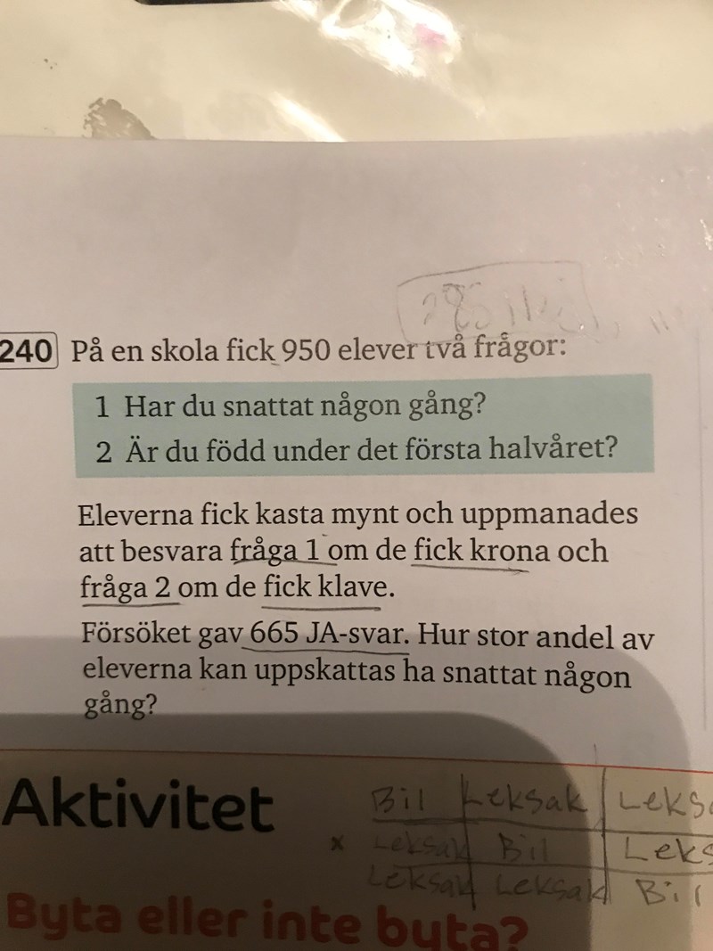Det var 950 personer som svarade på frågorna. Hälften av dem svarade på frågan "Är du född under första halvåret?". Det borde vara ungefär 238 som har svarat "ja" och 238 som svarat "nej" på den frågan. Det innebär att det är 665-238 = 427 som har svarat "ja" frågan om de har snattat och 47 som aldrig har snattat. Kan du svara på fråga i uppgiften nu?