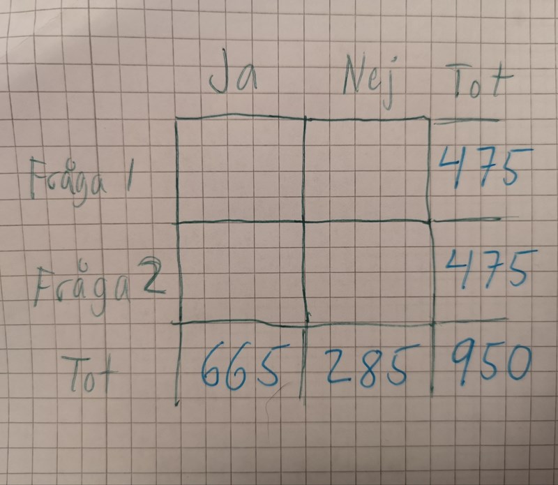 Du har själv sagt att det är 50 % som svarar på fråga 2 och att 50 % av dessa svarar "ja". Hur många är det som svarar ja på fråga 2, när man vet att det var 950 elever som svarade totalt?
