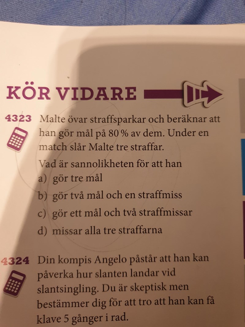 Smutstvätt skrev:Nu har du beräknat sannolikheten för "Mål, mål, miss", men "Mål, miss, mål" och "miss, mål, mål" ingår också i "två mål och en miss". Vad blir den totala sannolikheten för alla tre möjligheter? :)