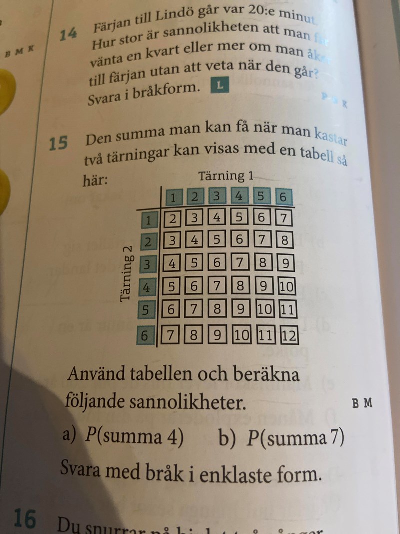 Nej 3/36 (= 1/12). Gynnsamma utfall / möjliga utfall. Det finns 3 fall där vi får summan 4 (det vill vi ha), och det finns totalt 36 olika fall.