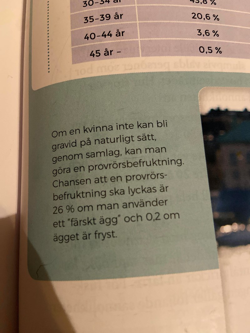 Marie51 digital volontär skrev:Du har antalet provrörsbefruktningar med färska ägg som görs och antal procent som anger hur många som lyckas. Då kan du räkna ut hur av de färska äggen som ledde till att en kvinna blev gravid.