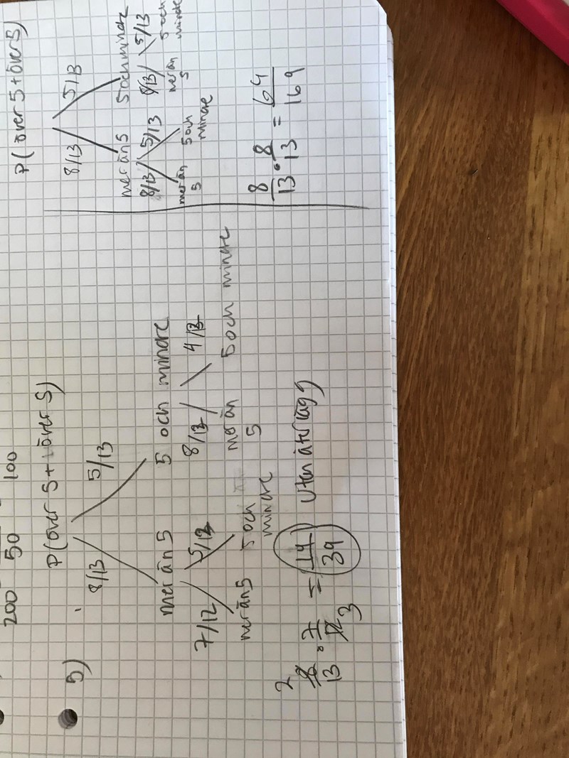 ” Ta det 13 hjärterkorten ur en kortlek. Dra två kort av hjärterkorten. Hur stor är chansen att det andra kortet är mer än fem om det första du drar en åtta och Ess räknas som ett?