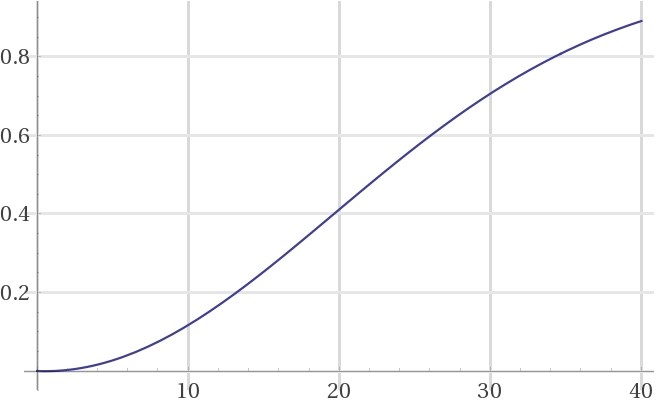 Sannolikheten (y-axeln) för att n elever har n olika födelsedagar (x-axeln) blir så här upp till 40 elever.