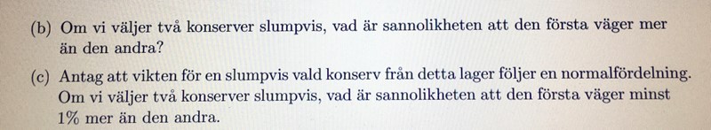”I ett lager finns ett stort antal konserver. Konserverna väger i genomsnitt 405 gram och vikterna varierar med en standardavvikelse 2 gram.”
