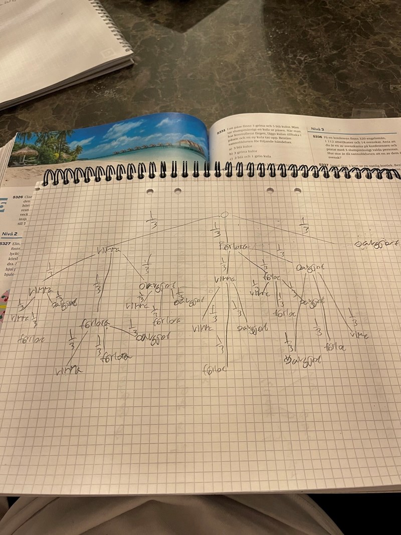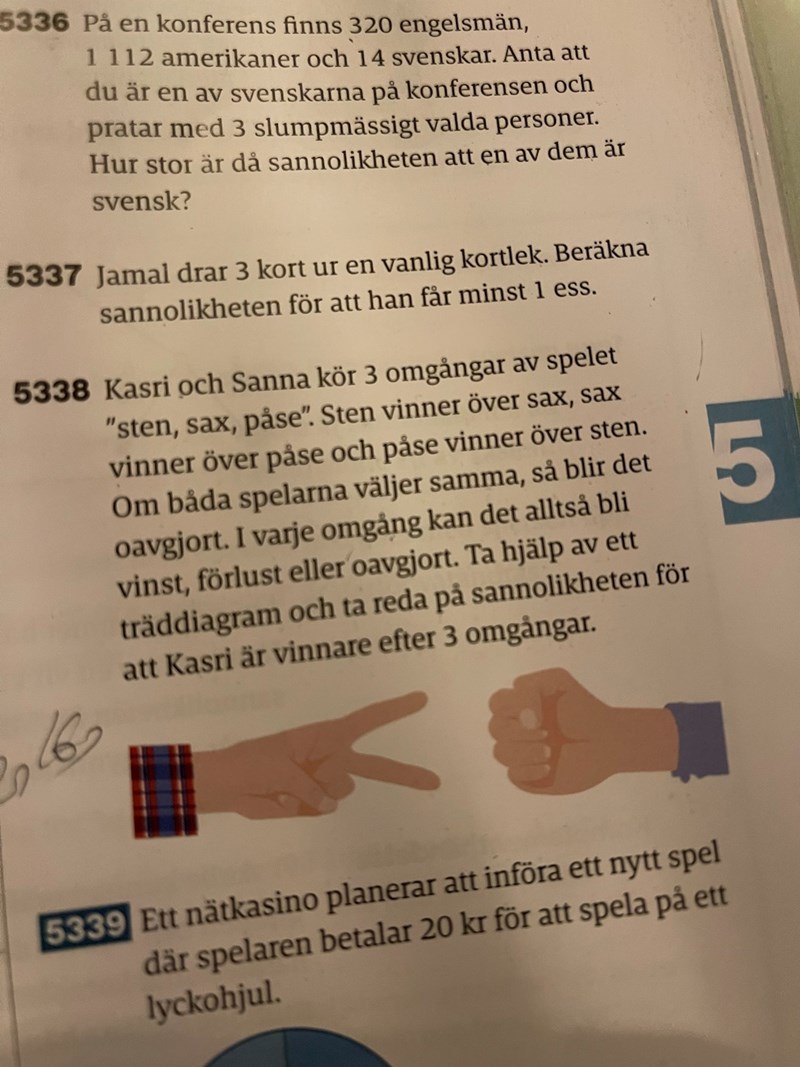 Hej! Jag behöver hjälp med 5338. Är inte sannolikheten för att vinna 1/3 och att inte vinna 2/3. Kasri borde vinna om han vinner minst två. Då borde sannolikheten stt han vinner vara 1/27 + 2/27 + 2/27 + 2/27=7/27.