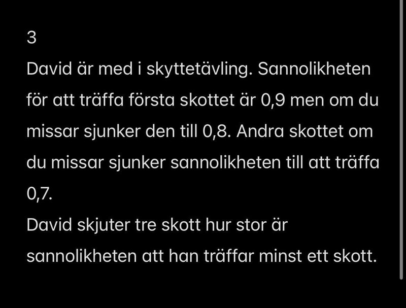Sannolikheten att han missar alla tre skott är 0,1*0,2*0,3=0,006=0,6%. Komplementet (dvs att han träffar minst en) blir då 100%-0,6%=99,4%.