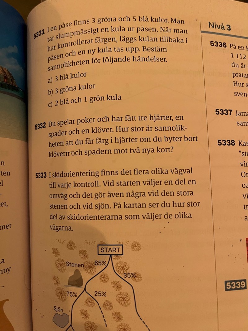 Hej! Jag behöver hjälp med 5332. Borde det inte vara 10/47 gånger 9/46, eftersom sntalet hjärter minskar när man tar det andra kortet. I fscit står det dock 0,042