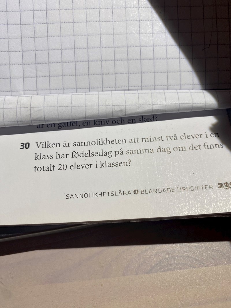 Ledtråd: Kan du räkna ut sannolikheten att allihop har olika födelsedagar?