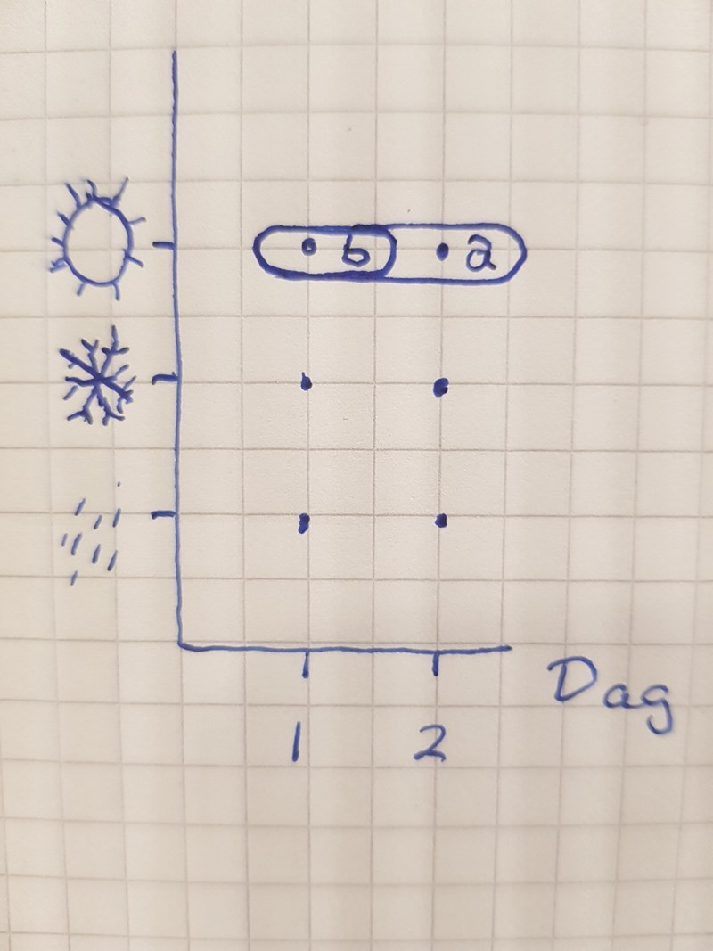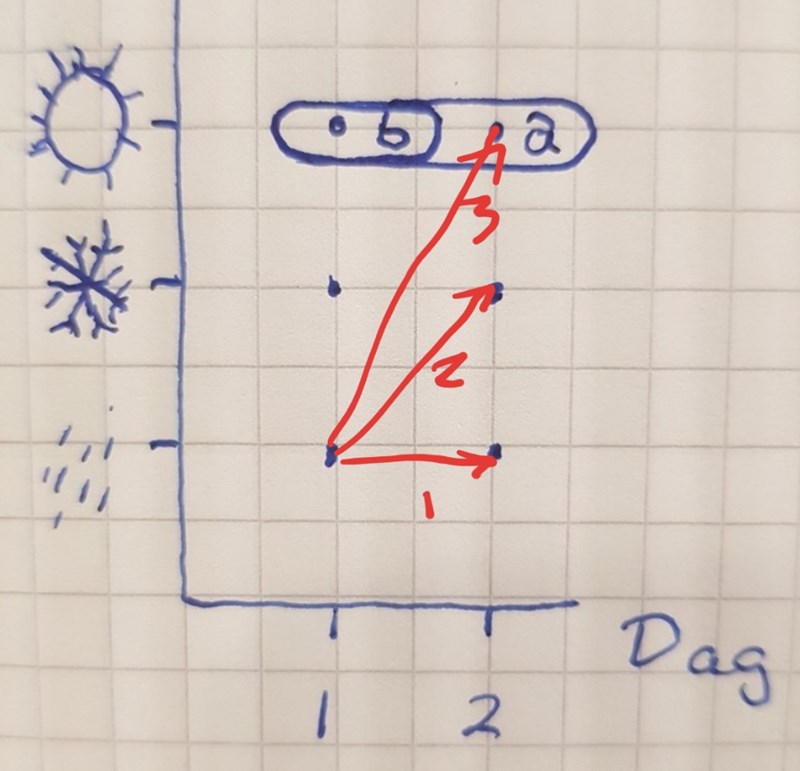 Det blir nog tydligt om du istället gör ett diagram med regn, snö och sol på båda axlarna. Kalla den horisontella axeln "väder dag 1" och den vertikala "väder dag 2".
