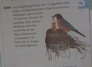 sedan tänkte jag att det då kanske är 4/5^15, för logiskt sätt borde ju sannolikheten att ingen mamma alls är där ska bli mindre. Då blir sannolikheten ca 0.035, så sannolikheten att träffa en fågel blir 1-0.035=0.965