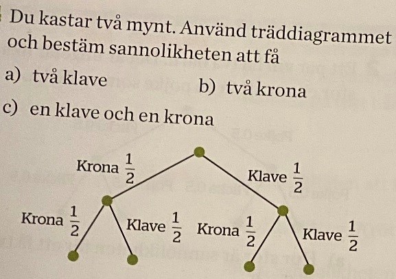 Fall 2: Du får en klave och sedan en krona. (Förgreningen till höger). Sannolikheten blir 1/2×1/2=1/4