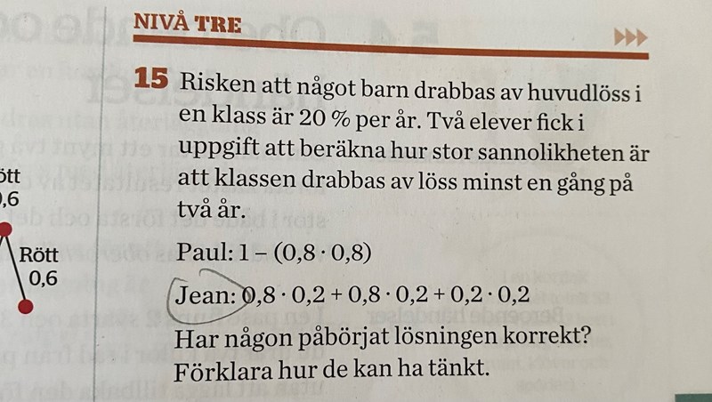 Han har räknat på komplementhändelsen, alltså att klassen klarar sig två år utan löss. Den är A i ditt diagram. Sedan tar man 100% minus den sannolikheten.