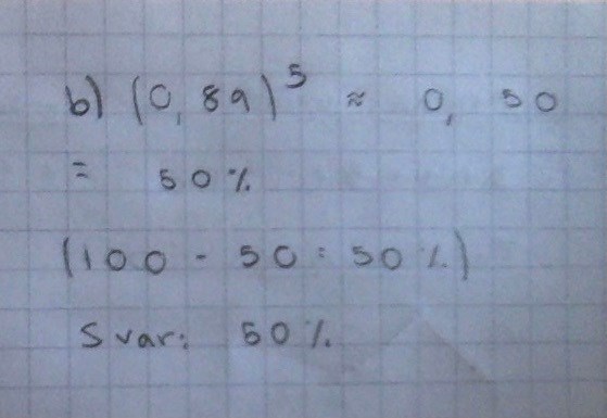 Jag löste det så som på bilden nedan och fick alltså svaret 50%. Men i facit står det att rätt svar är 44%. Dock står det att rätt "formel/sätt att lösa uppgiften på" är (1-(0,89)5) och jag tänker att det var typ så jag löste uppgiften?