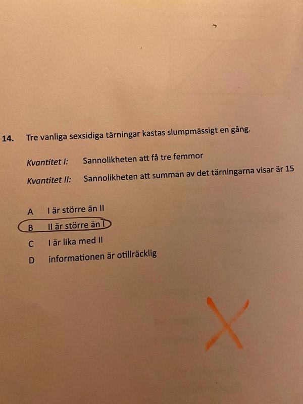 Tänker jag rätt? Eller ska jag räkna ut kva (2) ordentligt dvs hur många gynnsamma utfall (kombinationer som kan skapa summan 15)?