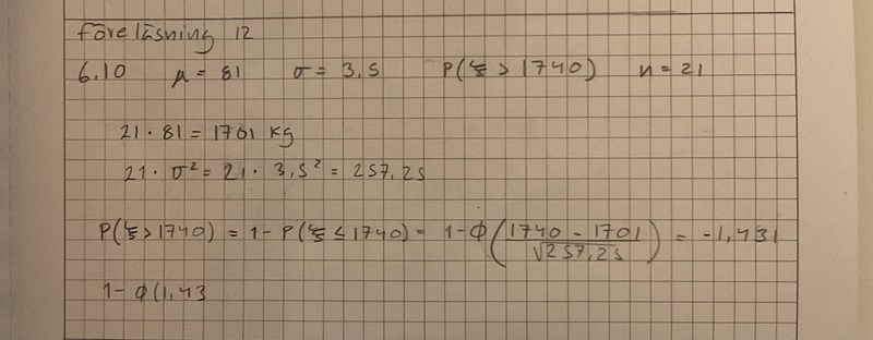 1. flygpassagerarna från en storstad har en kroppsvikt som kan anses normal fördelad med väntevärdet 81 och standardavvikelse 3,5. Hur stor är sannolikheten att 21 såna passagerare tillsammans väger mer än 1740 kg. Svaret här ska bli 0,75%.