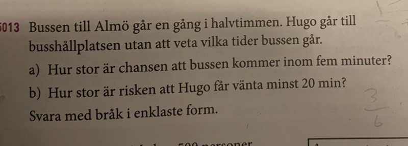 johan193axelson skrev:Hur stor del av halvtimmen har en väntetid på minst 20 minuter? Jo, från att bussen just gått tills 20 minuter före nästa. Rita gärna upp en bild av en klocka.