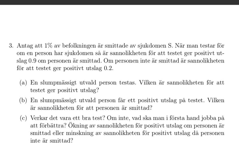 Smaragdalena skrev:Om man missar sannolikheten för positivt utslag då personen inte är smittad blir andelen högre på fråga b. Det verkar inte som ett bra test tycker jag.