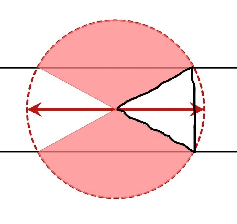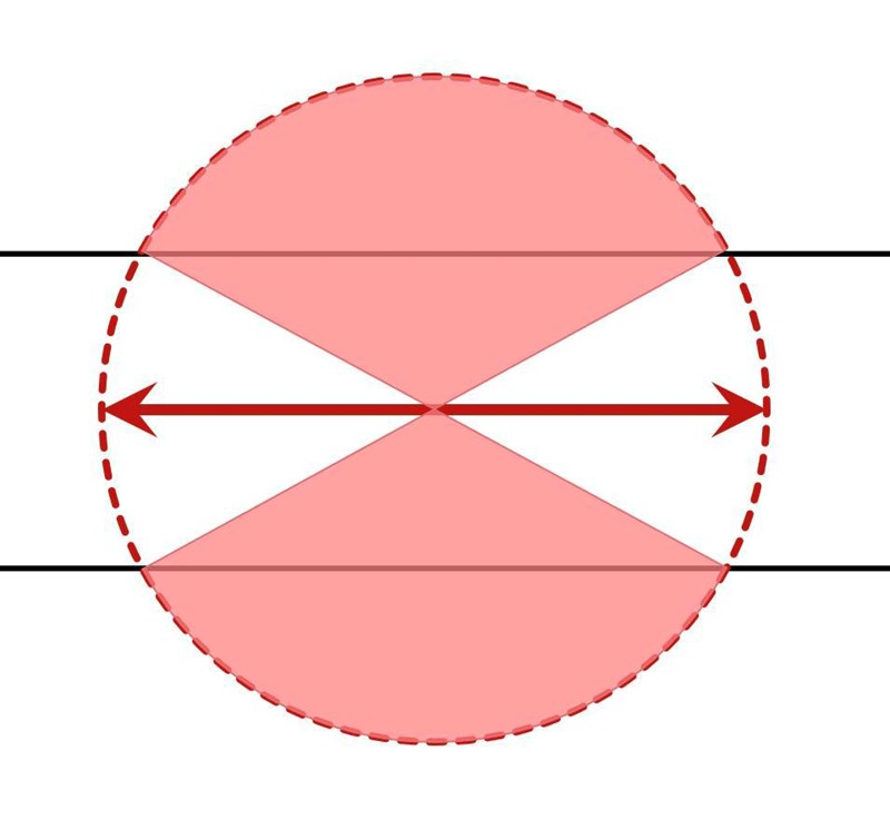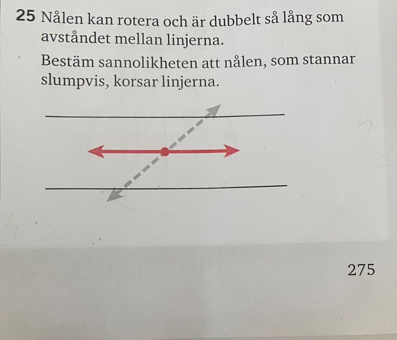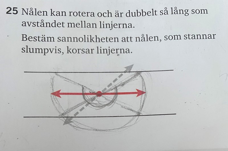 Om nålen hamnar inuti det rödskuggade området, innebär det att nålen korsar linjerna. Om nålen håller sig inuti det vita/oskuggade området, korsar nålen inte linjerna. Var linjen hamnar är slumpmässigt. Hur stor är sannolikheten att linjen landar i det rosa området? :)