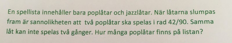 Om en spellista bara innehåller jazz och poplåtar. När låtarna slumpas fram är sannolikheten för att två poplåtar ska spelas i rad 42/90- men samma låt kan inte spelas två gånger. Hur många poplåtar finns det på listan?