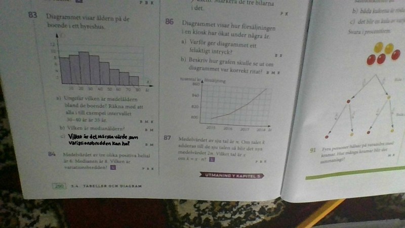 86 a) Grafen börjar inte vid noll vilket gör att försäljningen ser ut att ha fördubblats under de senaste åren men i själva verket så kanske det inte är en sån står ökning. Axlarna är alltså graderade på ett lurigt sätt