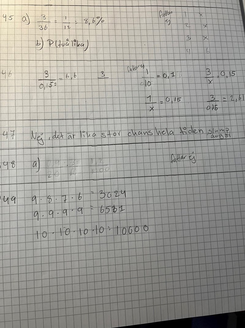 49. Astrid har en pinkod med 4 siffror till sin mobil, hon har glömt bort sin kod men minns att den består av siffrorna 2,5,7 och 8. Astrid chansar. Hur stor är sannolikheten att hon slår rätt kod på första försöket?