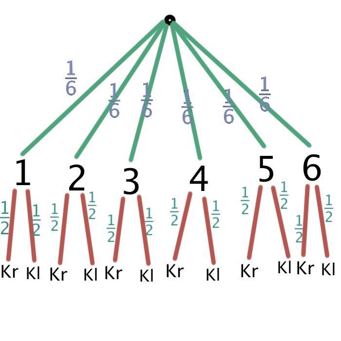 Om vi tar ett exempel: Vi kastar en tärning, och singlar sedan slant. Vilken är sannolikheten att vi får: