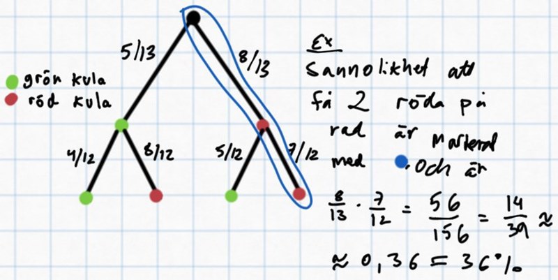 5/13 . 4/12 = 20/156 = 5/39 = 0,13 = 13%. Tack så mycket och nu förstår jag. Tusen tack.