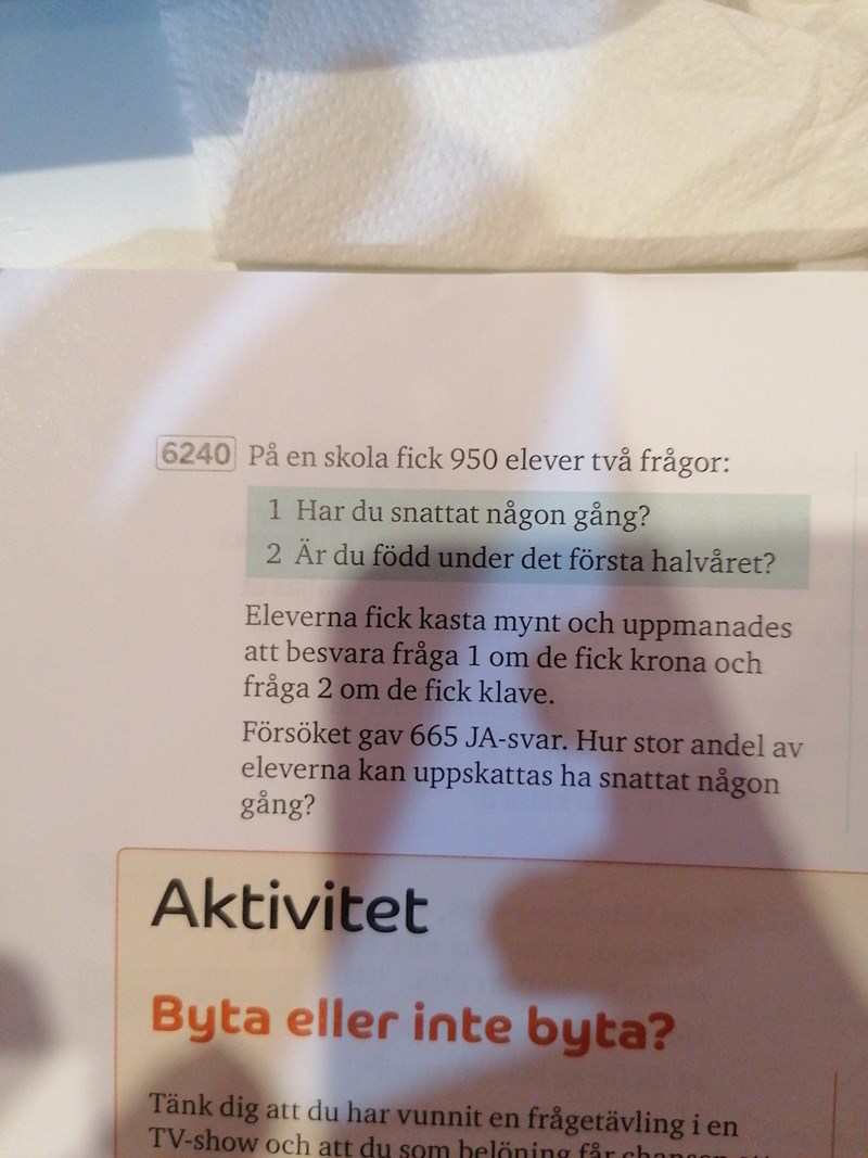 Smaragdalena skrev:Hälften av eleverna, d v s 475 stycken, bör ha svarat på fråga 1 och lika många på fråga 2. Om vi antar att hälften av eleverna är födda under första halvåret, så borde det vara ungefär 238 elever ha svarat ja på fråga 1, så det betyder att 427 elever har svarat JA på fråga 2. Med tanke på att det var 475 elever som svarat på fråga 2 så är det ganska många procent...