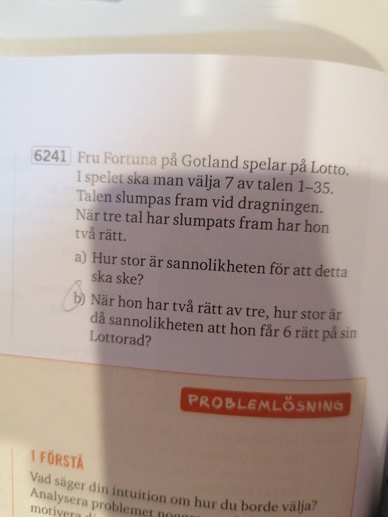Ture skrev:anonym00001 skrev:Smutstvätt skrev:Hon har gissat på sju nummer, varav vi vet hur det gick på tre av dem. Två var rätt, och ett var fel. Hur många nummer är det kvar, och vad behöver hon ha för resultat (rätt eller fel) på dem? :)