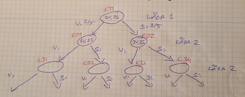 Du kan nu rita två nya grenar ut från respektive C21 och C22. Dessa grenar illustrerar på samma sätt dragen "vit boll" respektive "svart boll" ur låda två och leder till ytterligare nya cirklar C31, C32. C33 och C34.