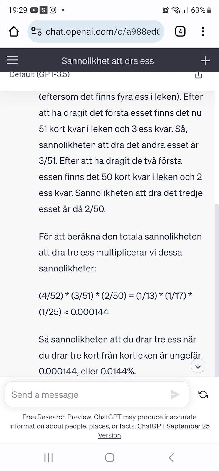 Men när jag räknar alla tillsamma4÷52×3÷51×50 =0,2262443439 det känns det är fel