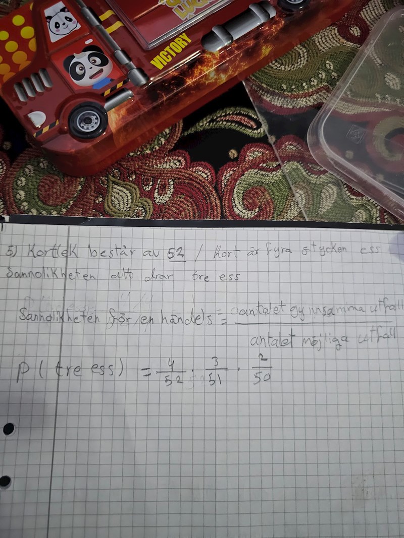 En kortlek består av av 52 kort och av dessa kort är fyra stycken ess. Vad är sannolikheten att du drar tre ess om du drar tre kort från kortleken? Redovisa alla dina beräkningar.