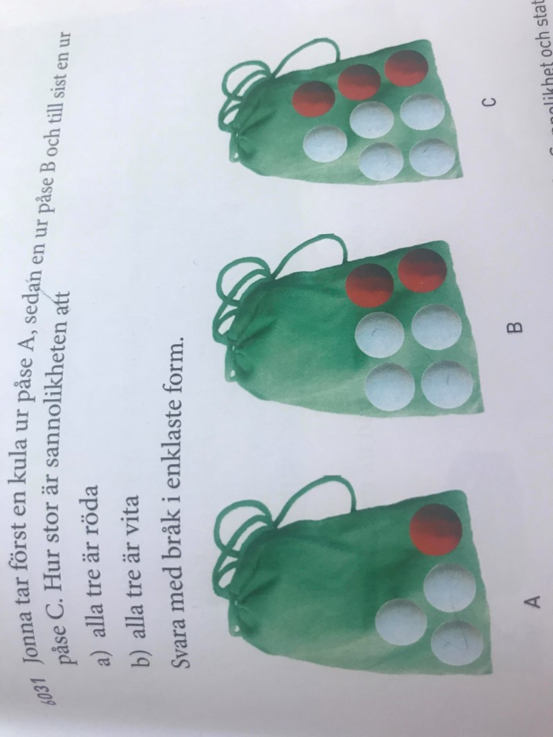 Hur stor är sannolikheten att få en röd kula i påse A? I påse B? I påse C?