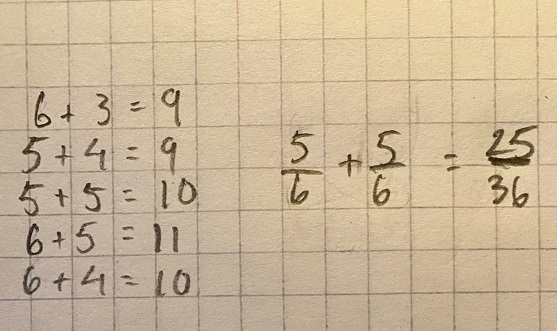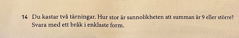 Mitt svar är 25/36 men det står sen att man ska förenkla och det går inte att förenkla. Svart i facit är 5/18