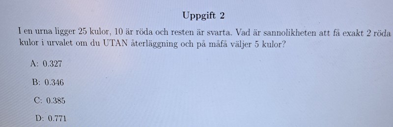 destiny99 skrev:sictransit skrev:Hypergeometrisk fördelning är din kompis, om du inte vill rita ett träddiagram som man gjorde i högstadiet.