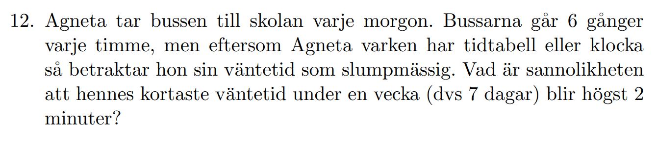Sannolikheten att man får vänta på bussen mer än 2 minuter, dvs , en given morgon är alltså 0.8.