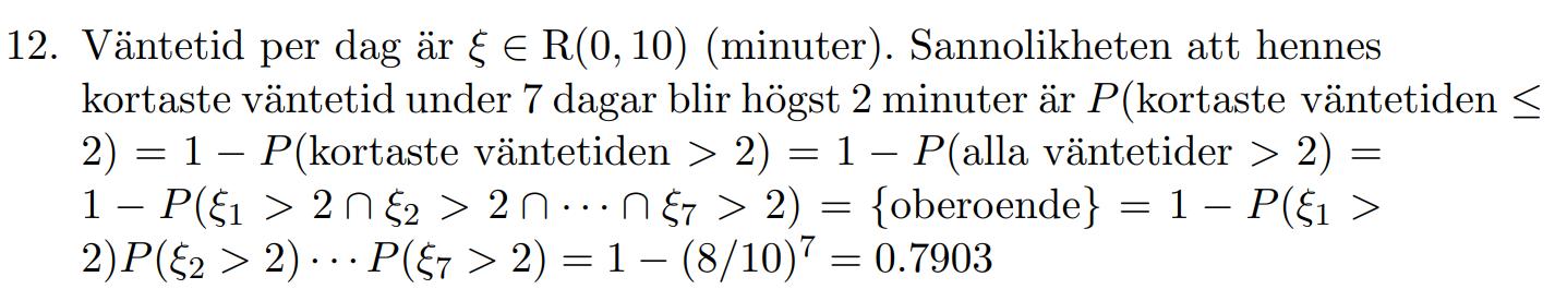 Det du räknade ut är sannolikheten att få vänta högst två minuter en given morgon (0.2). Sedan räknade du ut sannolikheten att få vänta höst två minuter 7 dagar i rad (). Och det är inte samma sak. Är du med?