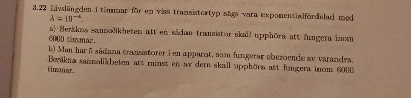 Marilyn skrev:Om du beräknat sannolikheten, säg p, att en upphör inom 6000 h, så är sannolikheten att den fungerar efter 6000 h lika med (1–p).