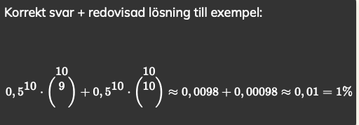 Sannolikheten (10C8 + 10C9 + 10C10) / (2^10). Helt fel svar.