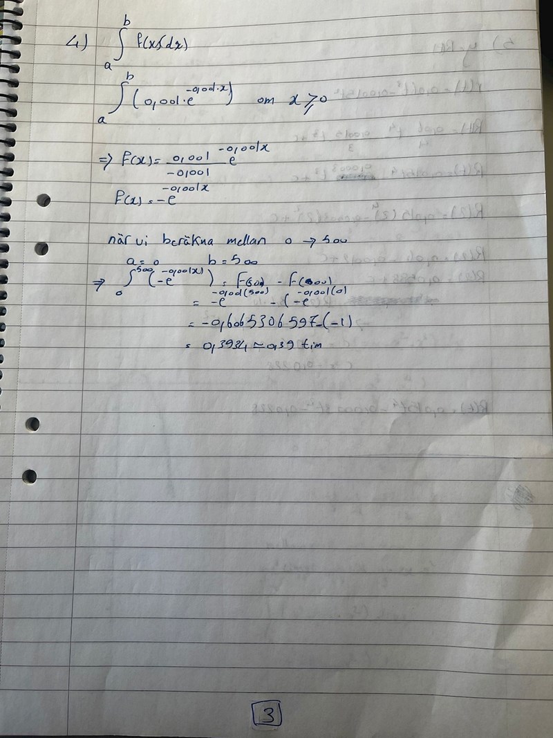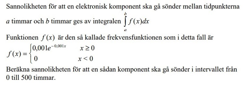 Hej jag är fast på denna uppgiften nu också. Jag förstår inte precis vad svaret blir. Alltså vad är sannolikheten för att komponenten ska gå sönder i intervallet 0 till 500 timmar? 0,39?