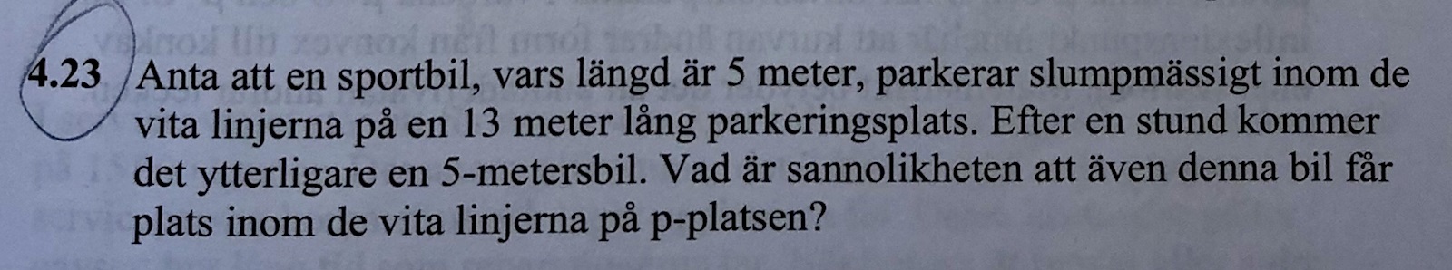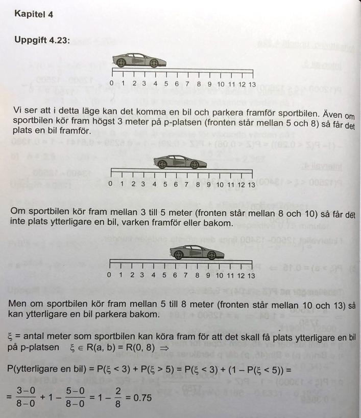 Om du slumpmässigt väljer ut ett värde, utan att något särskilt påverkar urvalet, är sannolikheten att välja värdet x, precis lika stor för alla möjliga värden på x. I detta fall kan sportbilen välja att parkera varsomhelst i parkeringsrutan, utan att något särskilt påverkar urvalet. :)
