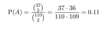 Hej, jag undrar vad detta är för sannolikhetsfördelning? Frågan handlar om att man på ett kontor med 110 anställda varav 37 är vegetarianer väljer ut två slumpmässiga personer (utan återläggning). Och vi vill beräkna sannolikheten för att dessa två personer är vegetarianer.