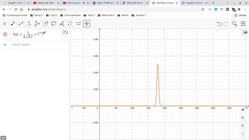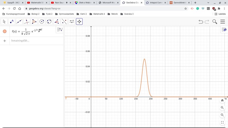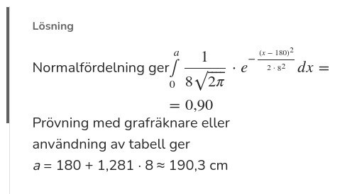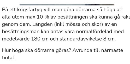 Programmeraren skrev:Grafen visar fördelningen av manskapets längd, hur stor andel som har vilken längd. Du vill att dörrens höjd ska låta 90% av besättningen gå raklång igenom. Skulle tex dörren vara 180 cm skulle 50% kunna gå igenom. Arean till vänster om 180 cm är 50% av hela arean.