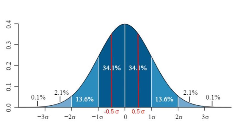 Nja, sannolikheten för värden mindre än -0.5 är också 0.3085 (du kan aldrig ha negativ sannolikhet) Titta på bilden av normalfördelningen ovanför så ser du att det hela tiden är lika stora slices på båda sidor.