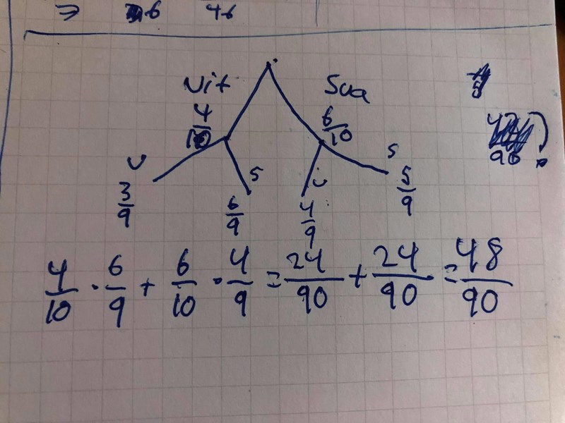Jag fick det till 48/90 medan svaret är 42/90, eller som i facit 7/15 (samma sak). När jag ritar ett träddiagram får jag detta: