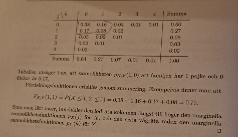 Trinity2 skrev:Se i boken om marginalsannolikhet. När man summerar en rad eller kolumn får man värden för marginalerna. Din summa är marginal-slh för P(Y=k1)